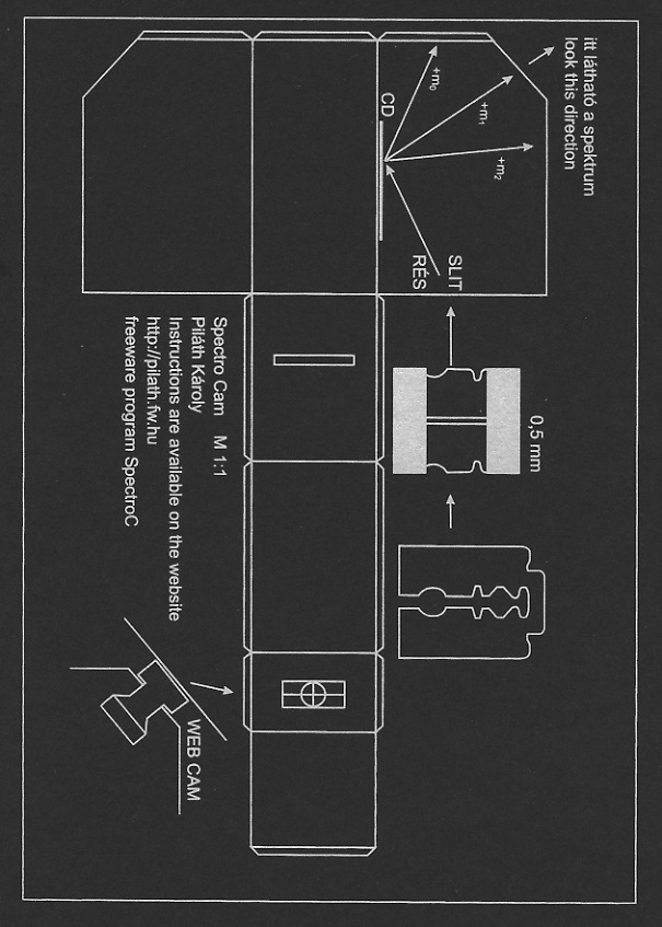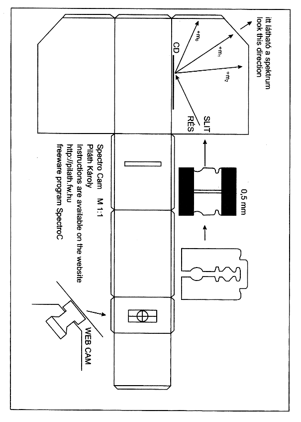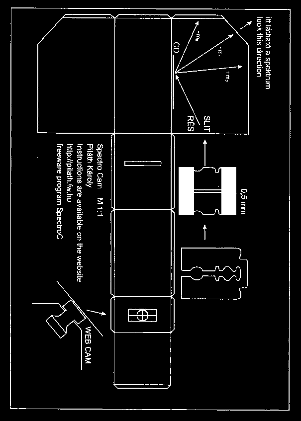 | Bauanleitung eines Spektroskops low-cost. Pappschablone zum Ausschneiden, für CD-Stück als Gitter und Webcam. Die Kopiervorlage unter (jpg gif tif bmp alle Dateien unter 200kB Theorie zu Winkeln am geneigten Gitter hier aud Deutsch (pdf). Eine Webcam-Software AMCAP ist gratis zu laden Quelle: Science on Stage Genf, November 2005, CERN, Genève, Suisse, Delegation Ungarn |