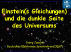 | Präsentation des Vortrags zur dunklen Materie und dunklen Energie: "Einstein und die dunkle Seite des Universums", Dr. Jörg Jaeckel, DESY, am Li Hamburg zum Einsteinjahr, 54 Seiten (ppt 38 MB ! ) (pdf 2,2 MB) |