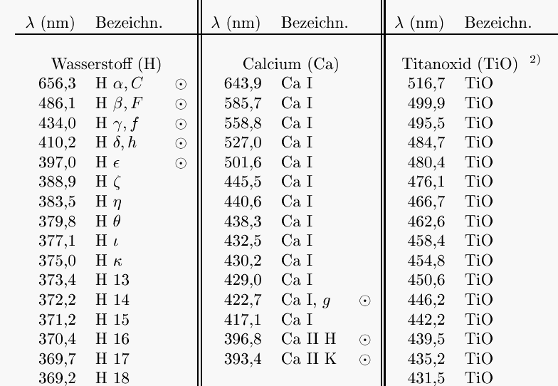 Wellenlängen einiger Spektrallinien und -banden, u.a. der Fraunhoferlinien (pdf, 84kB) |