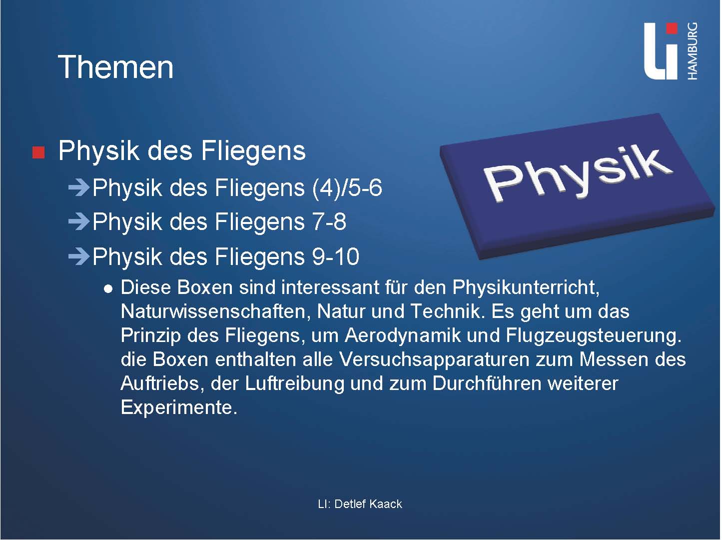 Diese Boxen sind interessant für den Physikunterricht, Naturwissenschaften, Natur und Technik. Es geht um das Prinzip des Fliegens, um Aerodynamik und Flugzeugsteuerung. die Boxen enthalten alle Versuchsapparaturen zum Messen des Auftriebs, der Luftreibung und zum Durchführen weiterer Experimente.