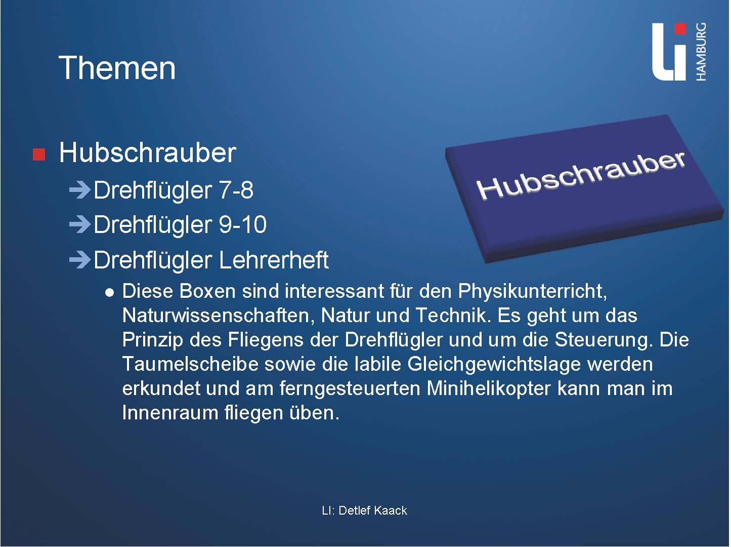 Diese Boxen sind interessant für den Physikunterricht, Naturwissenschaften, Natur und Technik. Es geht um das Prinzip des Fliegens der Drehflügler und um die Steuerung. Die Taumelscheibe sowie die labile Gleichgewichtslage werden erkundet und am ferngesteuerten Minihelikopter kann man im Innenraum fliegen üben.