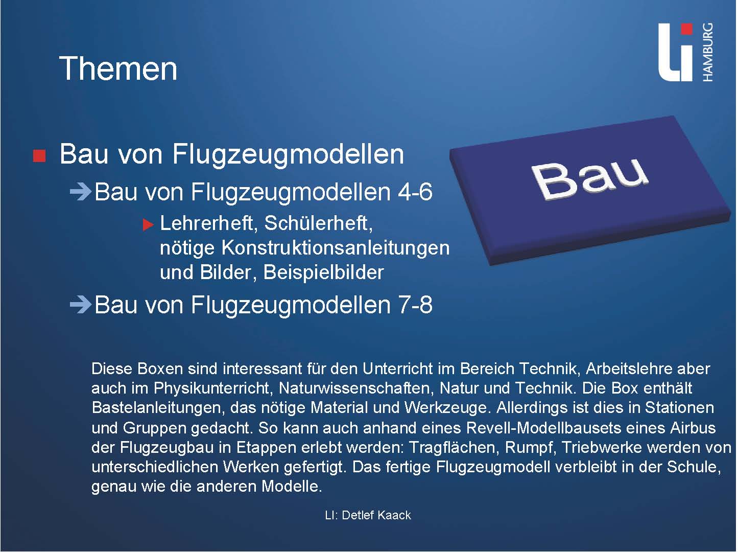 Diese Boxen sind interessant für den Unterricht im Bereich Technik, Arbeitslehre aber auch im Physikunterricht, Naturwissenschaften, Natur und Technik. Die Box enthält Bastelanleitungen, das nötige Material und Werkzeuge. Allerdings ist dies in Stationen und Gruppen gedacht. So kann auch anhand eines Revell-Modellbausets eines Airbus der Flugzeugbau in Etappen erlebt werden: Tragflächen, Rumpf, Triebwerke werden von unterschiedlichen Werken gefertigt. Das fertige Flugzeugmodell verbleibt in der Schule, genau wie die anderen Modelle.