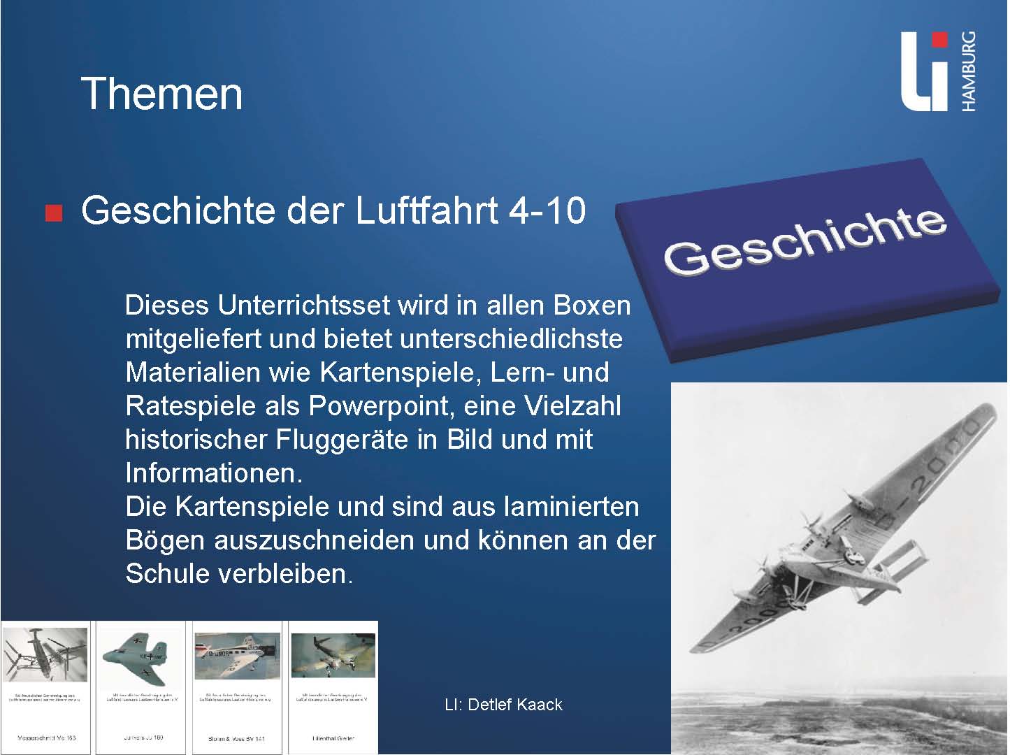 Es bietet unterschiedlichste Materialien wie Kartenspiele, Powerpoint-Lern- und Ratespiele, eine Vielzahl historischer Fluggeräte in Bild und mit Informationen. Die Kartenspiele und sind aus laminierten Bögen auszuschneiden und können an der Schule verbleiben.