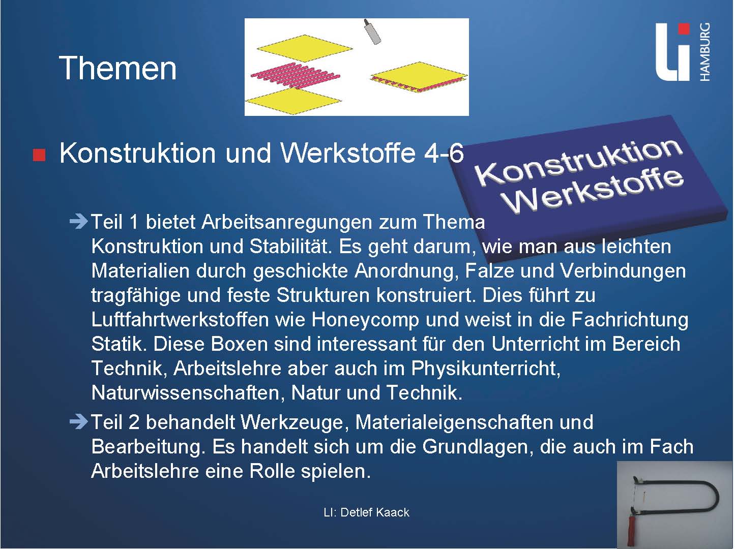 Teil 1 bietet Arbeitsanregungen zum Thema Konstruktion und Stabilität. Es geht darum, wie man aus leichten Materialien durch geschickte Anordnung, Falze und Verbindungen tragfähige und feste Strukturen konstruiert. Dies führt zu Luftfahrtwerkstoffen wie Honeycomp und weist in die Fachrichtung Statik. Diese Boxen sind interessant für den Unterricht im Bereich Technik, Arbeitslehre aber auch im Physikunterricht, Naturwissenschaften, Natur und Technik.
