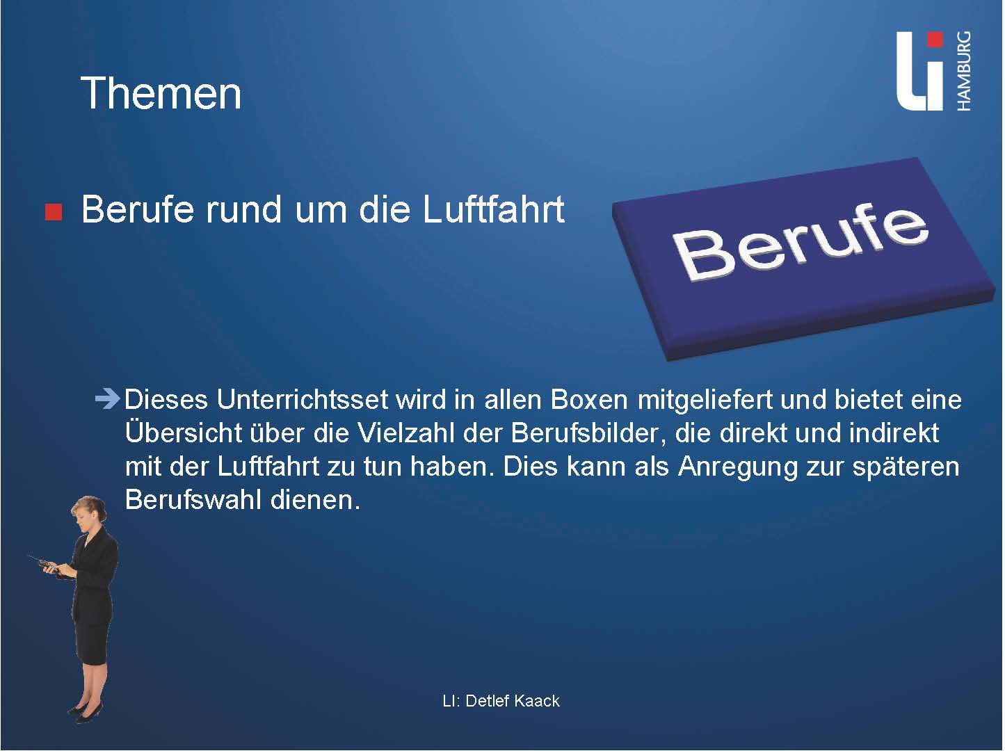 Dieses Unterrichtsset wird in allen Boxen mitgeliefert und bietet eine Übersicht über die Vielzahl der Berufsbilder, die direkt und indirekt mit der Luftfahrt zu tun haben. Dies kann als Anregung zur späteren Berufswahl dienen.